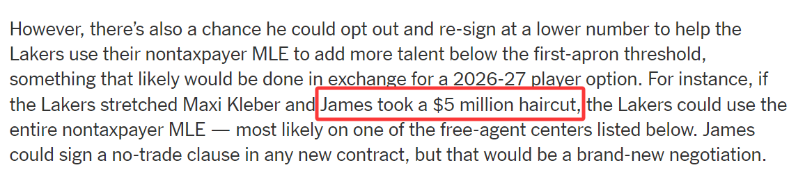 当然,他也有其他选择,比如跳出合同,以更低薪资重新签约,帮助湖人利用 “全额中产特例”在第一土豪线以下补充更多天赋。